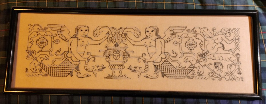 For the record, I stitched this piece in 1994, from a chart I redacted myself. The photo source that I worked from was in Schuette and Mueller-Christensen’s Pictorial History of Embroidery. I presented this chart along with my own original accompanying border on Plate 75 in my own The New Carolingian Modelbook, published in 1995.