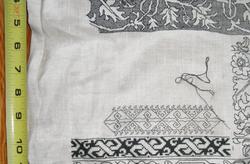 My sampler is worked on 36 count even weave linen, using one or two strands of standard DMC embroidery floss, colors #310 (black) and #498 (deep crimson). Worked over 2×2 threads, it’s done at 18 stitches per inch (about 7 per cm). The entire embroidered area measures out to roughly 16 x 32 inches (40.6 x 81.3 cm). I did not work it double sided, but the double sided logic does prevail.