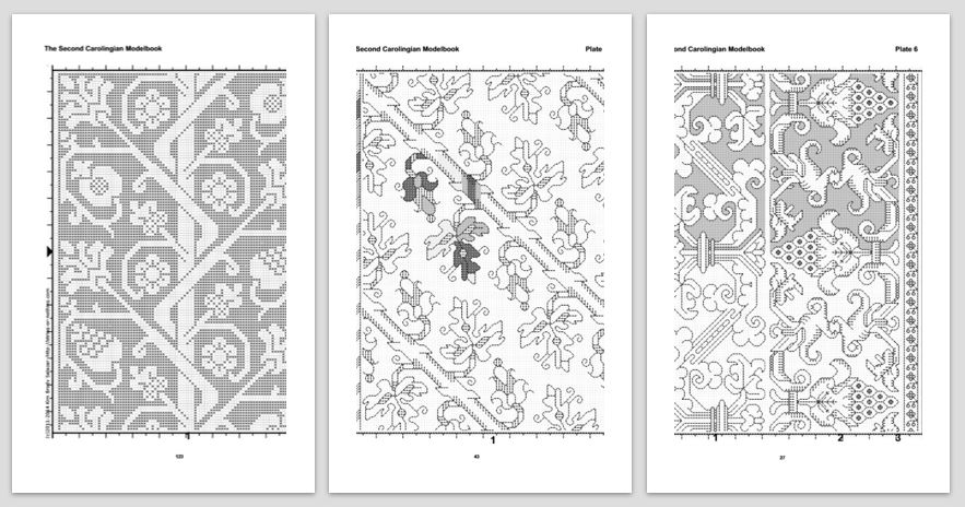 Like the first book, it is a treasury of charted designs for needleworkers and artisans. The 75 plates present over 250 individual borders, motifs, or all-over designs. These include both linear designs suitable for double running stitch, back stitch or other similar treatments; and block unit designs, suitable for long armed cross stitch, lacis/buratto, and other solid fill work of the time. Block unit patterns are also useful for modern interpretation using plain old cross stitch, filet crochet, tapestry crochet, or stranded colorwork knitting. There is good representation of designs appropriate for voided (reserva) work – both with and without accompanying linear outlines.