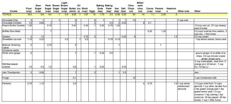 I have a master workbook. Each year I add a new sheet. I copy the previous year’s cookie row or enter new data. The sheet sums up my major ingredients at the top. It feeds into a shopping list form that I can tick off as have-on-hand or to-buy. There’s also a sheet where links or hard copy references to all the recipes live.