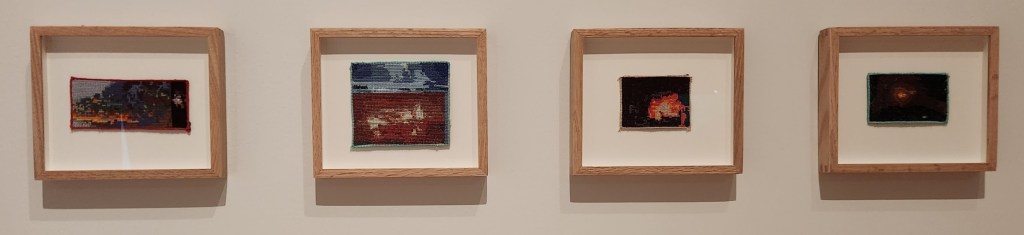 Right now they are offering After the Sun – Forecasts from the North – a collection of works by contemporary artists from the greater Scandinavian/Nordic/Icelandic sphere, as they contemplate the effects of climate change on the northern/Polar bordering landscapes and society. The works were done in many media, everything from traditional oil paint on canvas and carved wood/stone or cast sculpture, to stretched scraped membranes, and even a presentation of scented oil. And to my surprise it included a suite of cross stitched pieces. While it’s not uncommon for embroidery to be displayed in a museum, it is more usual for it to be seen by itself, and not as common for it to be displayed alongside other pieces outside of a historical context (like a “life in the 1500s” type exhibit). This was a general arts collection, with the stitched pieces being given the same respect of place as those done in more represented media.