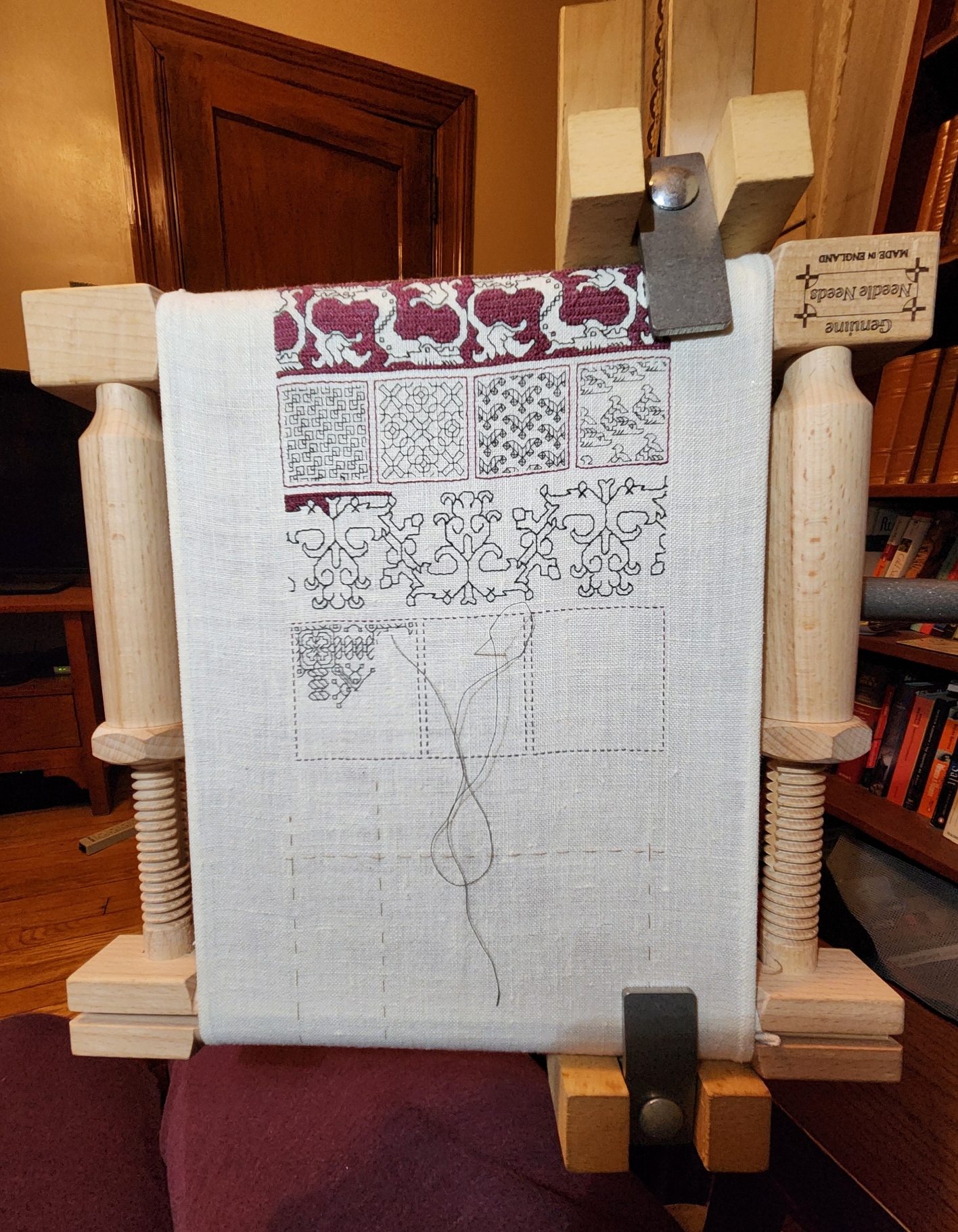 The myriad mistakes in my current piece are what inspired this post. In addition to the errant dolphins in the latest section, you can see that the voided bit currently underway wasn’t properly aligned. It’s a center line repeat, I have an even number of units across, but if you compare the left and right edges, you’ll see that the design is shifted two units to the right. The center of that strip does not align with the center of the set of boxes, above. The dolphin box is intentionally shorted one unit compared to the others in its row because my count across is not divisible by four (available area minus 6 units total for the gutters between the boxes). There are more similar mistakes in the previously completed part, now wound around the roller bars of my stretcher frame.