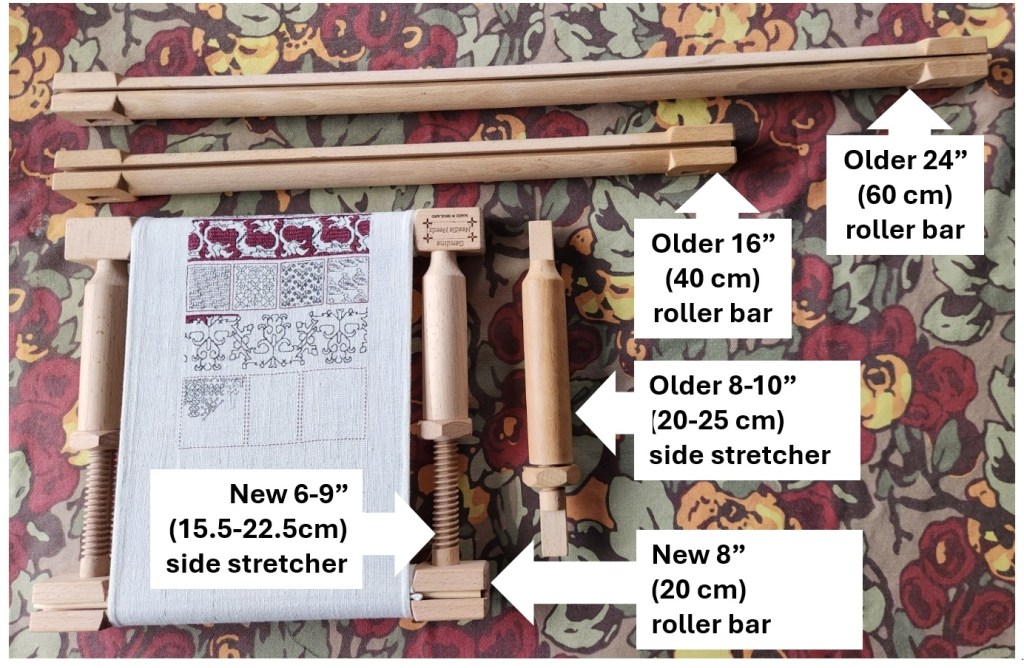 After months of hoop-in-hand, I was yearning for the scroll frame experience. I heard that Needle Needs had a new junior size frame, and was also offering smaller roller bar and side extension pieces for the Millennium system. So I sat down and weighed price, stitched area size, and the fact that pieces from the new junior frame are not compatible with its larger brother, then splurged on a pair of new extenders and roller bars.