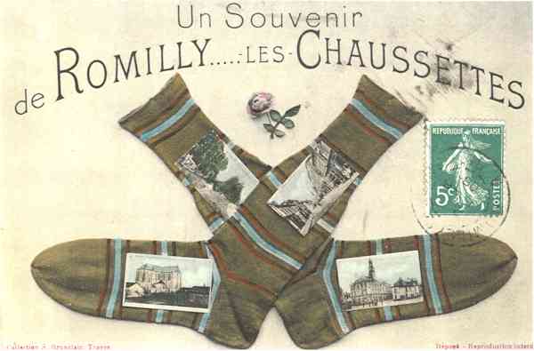 Romilly was a center of sock manufacture, with at least two large factories nearby producing socks and stockings. This line of regional specialty continues to at least March of this year, when Jacquemard, a major sock factory, closed. The town apparently has had the name “Romilly-les-Chaussettes” (Sock Romilly) for a very long time. Here’s her link detailing the passing of Jacquemard mills(for some reason it didn’t come through on her comment post): in French; in machine-mangled English.