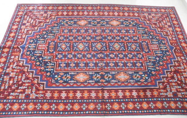 Remember I said that when we brought it home it was thick with dust? We brought it to a respected rug merchant and cleaning service to have it cleaned. It came back to us rolled for storage and sat that way for about 9 years. My dye-wise apprentice thinks that the cleaning reagents used worked on the cottons, and the blue especially migrated. The very uniform way that this happened (no “hot spots” or streaks) indicates that this probably happened when the rug was washed and dried, and indigo dyed yarns do sometimes shed pigment. I wish that the rug people had “come clean” and told me about the dye migration when we picked the thing up, but on the whole, the difference isn’t fatal. I’ll just try to avoid ever having to wash it again.