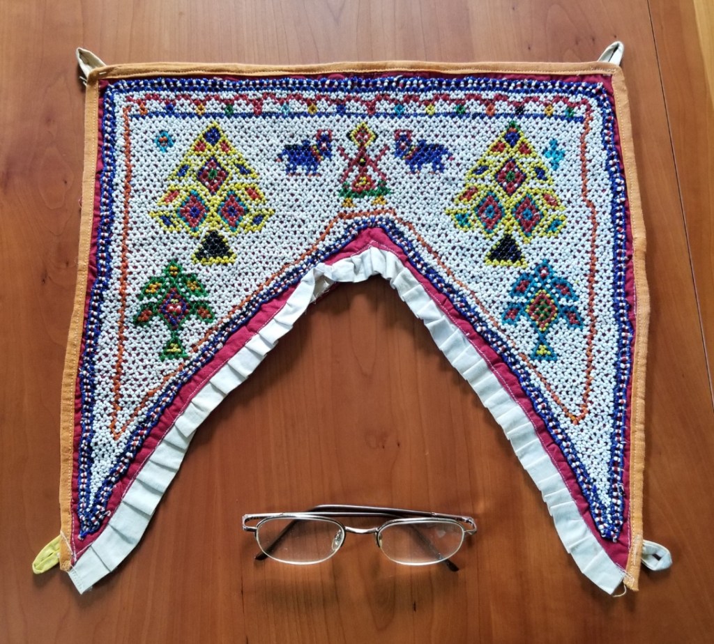 The beadwork style is called “Moti Bharat“, and is practiced in both Gujarat and neighboring Rajasthan, but is a relatively recent practice, only dating back to the mid to late 1800s. I don’t know enough about how the execution of this style differs between those two provinces to identify the exact source. All I can say is that compared to many on-line examples from both areas, it’s a rather modest and understated little piece.