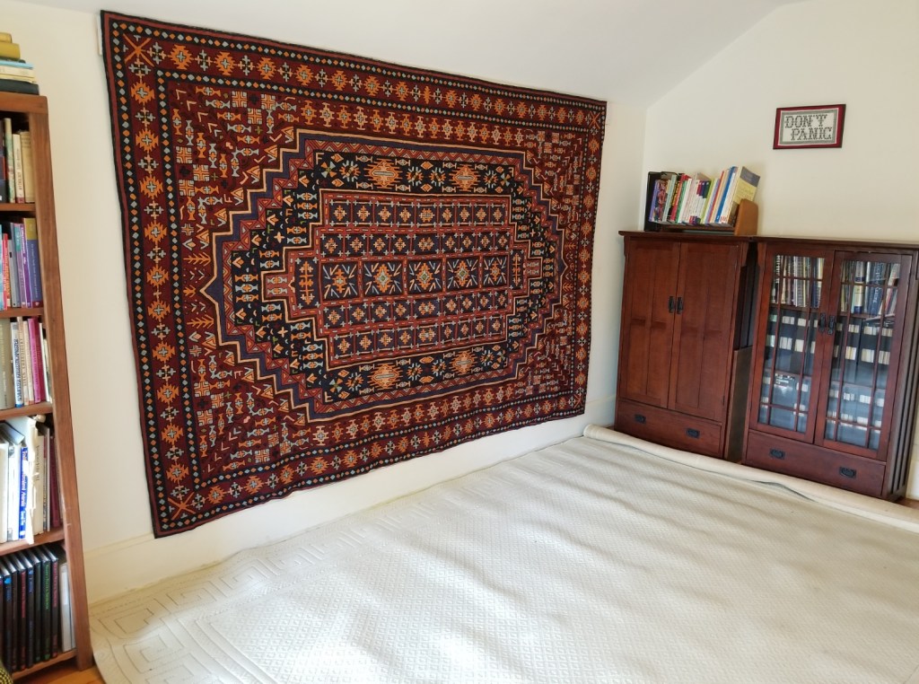 At long last, the tambour embroidered cotton rug we bought in India is on display! I have always wanted to put it someplace, but was loathe to use it on the floor. We did so in our apartment in Pune, and being fragile, keeping it clear of the sacred dust of the subcontinent was a bit of a challenge. I’ve been plotting and planning to hang it instead. But where? At one time I considered the stairwell or either the upstairs or downstairs hall, but when I began thinking about transforming the former bedroom of our now-independent Eldest into my office, greed overcame my desire to post it in a more public area of the house.