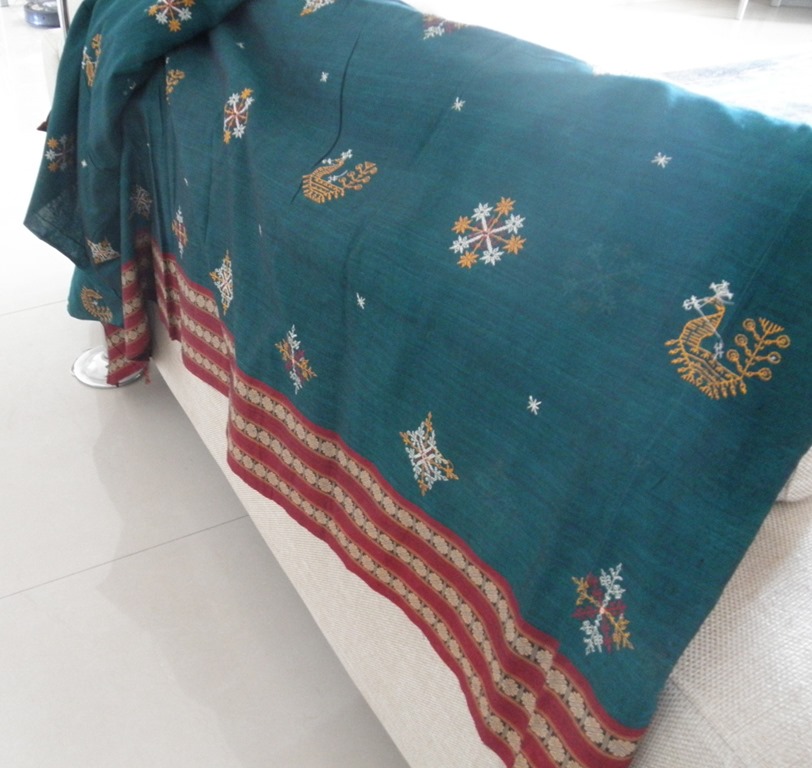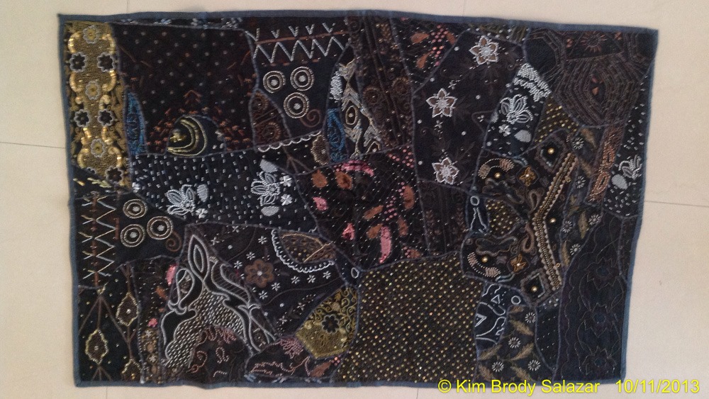 But I did find this piece. It’s NOT hand-made. It’s machine embroidered sari, using traditional colors and patterns on an all-cotton ground. In terms of scale, the stitches are about twice as large as the museum pieces I saw here in Pune, and in Delhi. But it’s unmistakably part of the heritage, and the seller was very surprised that I recognized it as such.