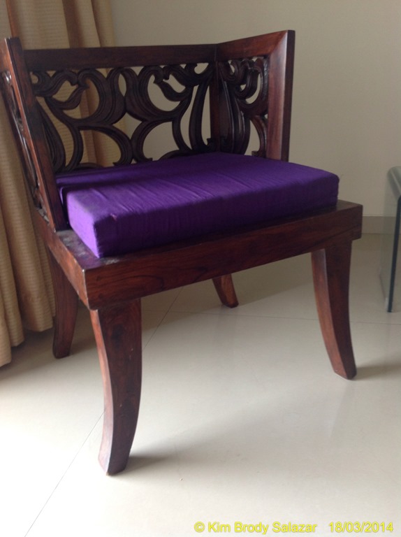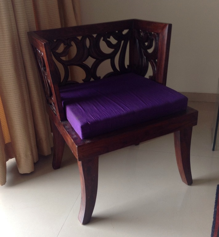 You may remember the chair, with its shoddy seat of fraying satin over a cheese-like block of squishy foam, purchased from Just Antiques in Pune: