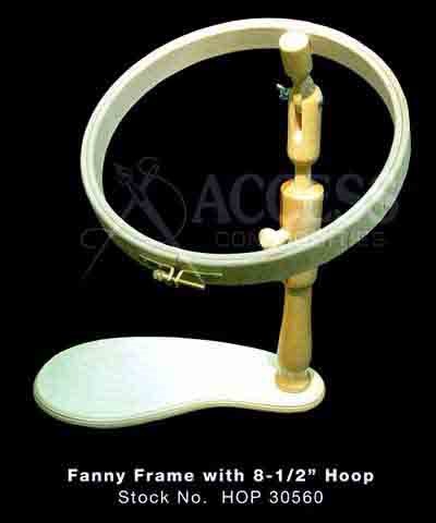 A Hardwicke Manor sit-on round frame (aka a fanny frame), and a tambour needle set (not shown in proportion to each other).