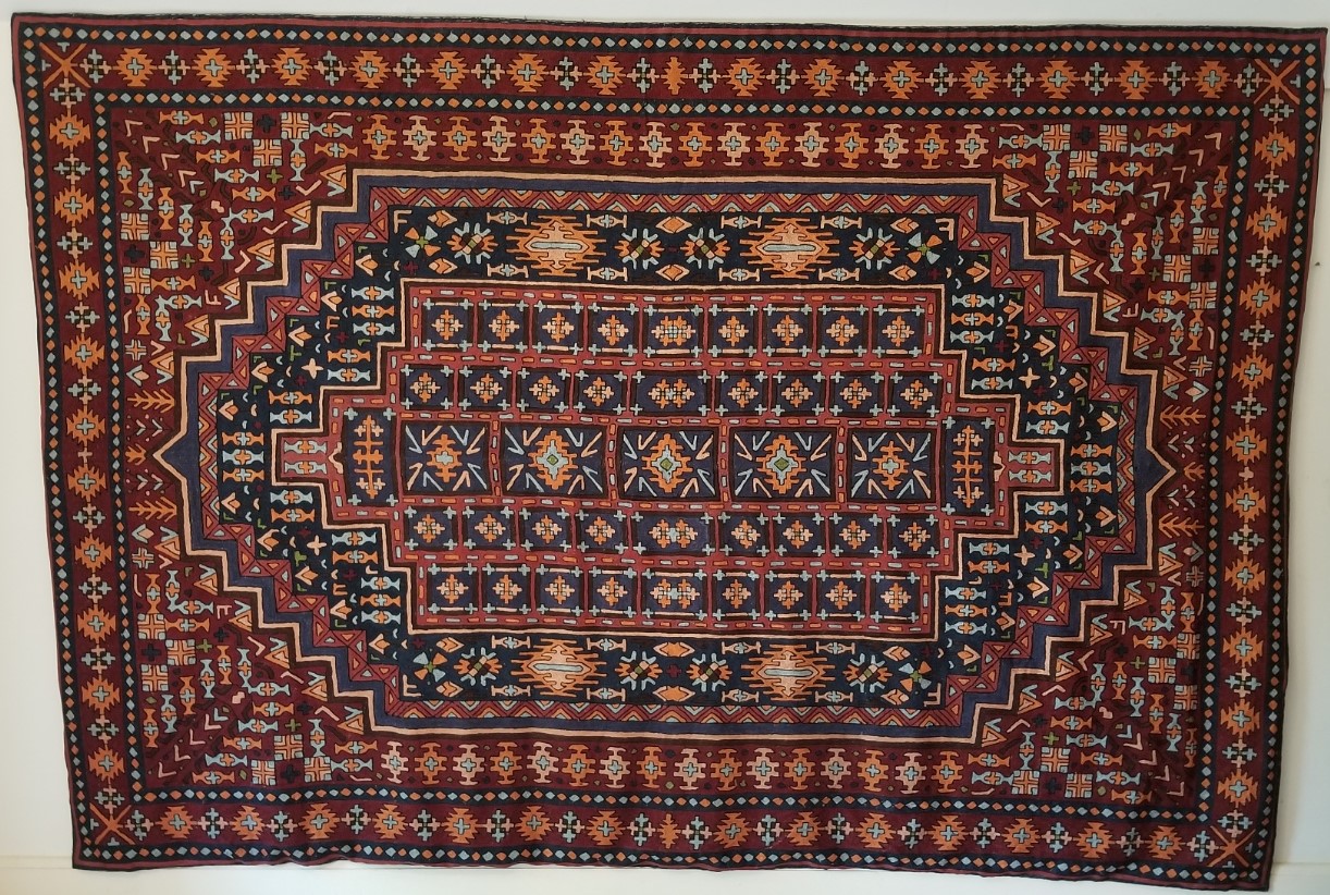 As to what the motifs symbolize – all I can say is that trees and the little bulls are traditional. The top center motif might be a representation of a divine figure, I can’t say. All I can observe is that the composition although balanced and pleasing is very simple for pieces of this type. It was a decoration that brought joy to a modest household, albeit it one of the means to afford such things. It now hangs in my house, and continues to bring joy.