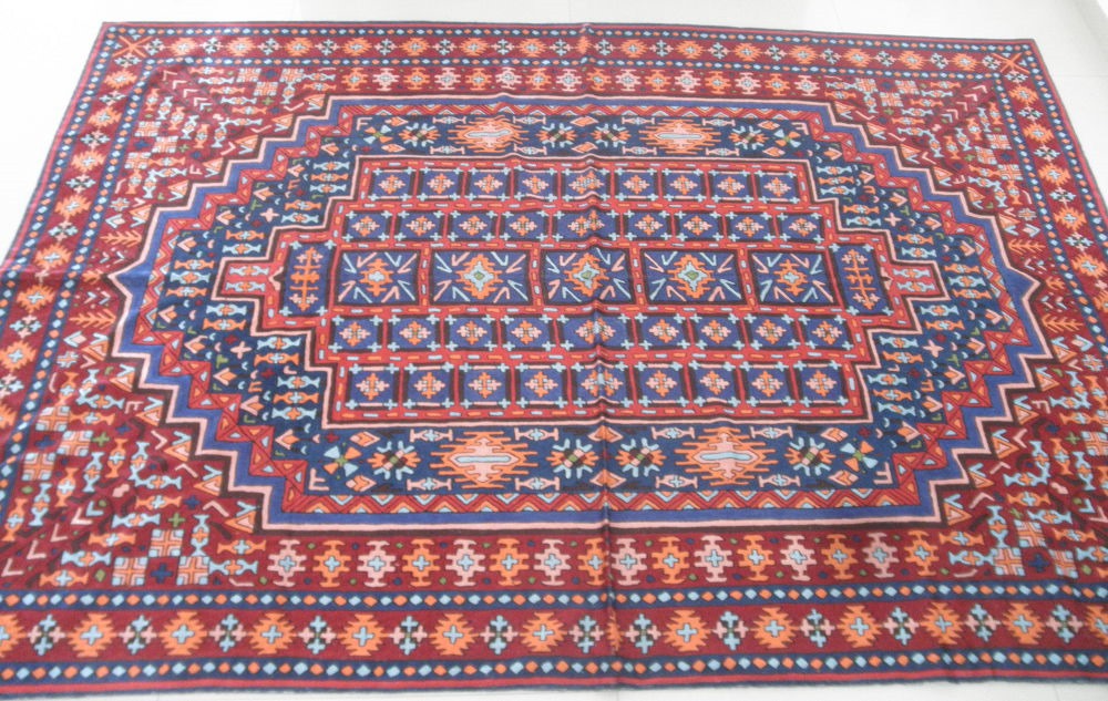 Back to our carpet – how long did it take to make? Tambour is speedy, but 6’ x 9’ is a huge amount of handwork. The crafts merchant who sold it to us said that these pieces were the product of family manufacture. It typically takes several people (I’m thinking four to six, more can’t easily fit around the cloth to work) about two weeks to make one this size. I base this on the fact that he says one family can produce between two and four big pieces per month. Ours was one of the largest. Most of the other samples of cotton tambour were about half this size. To my stitcher’s eye, ours was also the most accomplished of the four available cotton rugs. It was the most evenly and densely stitched, with the best color balance and patterning.