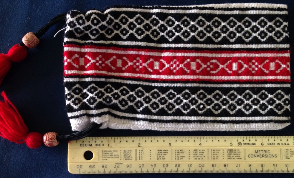 It’s also of Indian origin, assembled patchwork style from small pieces of sari borders and other embroidered snippets. In this case the backing fabric is cotton velour, instead of heavy flat-woven matte-finish cotton. I have a feeling that this bag is somehow related to the black hanging, if only distantly.