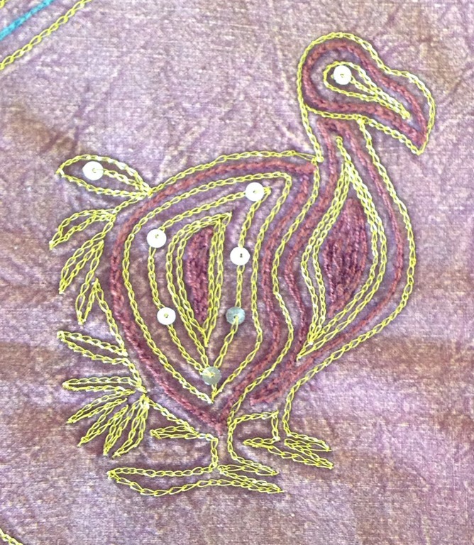 The pictures above look rather pinkish, but the actual background color is more dun than salmon or orchid. The dodos are worked in tambour-worked chain stitch in gold and brick, olive and mustard perle cotton on a double-thick cotton ground, then heavily washed. The sequins are affixed along the lines of the gold stitching. That along with the treatment of threads on the back clinches the working method for me.