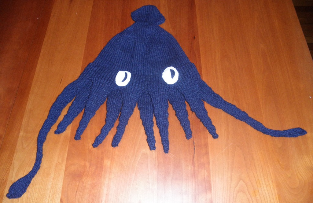 A brief foray back into knitting. A long-deserving, cephalopod-loving pal of mine bespoke a hat. Not just any hat, a hat in the shape of a squid. How could I turn down a challenge like that? So this weekend past, finishing up last night I made one.