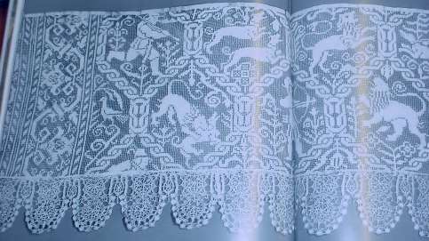 Lacis is worked by darning in the meshes on a hand-knotted net background. You start with a netted ground, then with needle and thread, weave in the meshes that need to be worked solidly. There’s a wonderfully arcane logic to designing one’s path of stitching so as to minimize ends. If you like themental excerciseof working double-sided blackwork or cross stitch, you’d really enjoy Lacis. For delicacy though, filet crochet just can’t compare:
