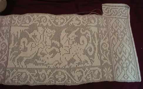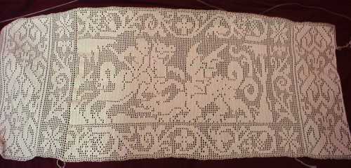 Although I was iffy about it when I first began, I think that it’s working now. Yes, introducing another motif makes the piece rather busy, but in spite of that – I like it. To be immodest, I’ve been scouring the web looking for filet crochet work, and I haven’t seen anything remotely like this – either for complexity of the motifs, or scale of the project. It’s going to look killer on the front door window.