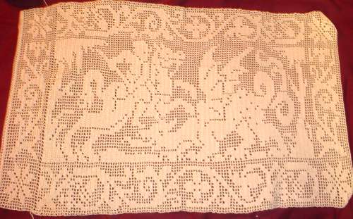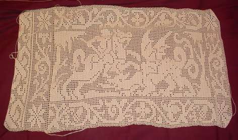Going back and working in the other direction from my cast-on row has created a bit of a fold. You can see it at the left hand edge of the tree behind the knight. It won’t be so evident when the piece is blocked out and stretched on the curtain rods. Other than that – I’m quite pleased with the way my experiment in filet is turning out. Thread consumption to date is in between 1.3 and 1.5 balls of the Coats & Clark Royale 30-weight. At around $3.00 per ball and $1.25 for the crochet hook, this is also turning out to be one of the least expensive projects I’ve done.