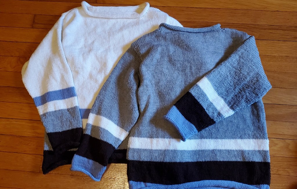 First, as a favor to my mom, an old school knitter from the days of Knitting Ladies who sat by your elbow throughout design selection, customization, swatching, and execution to gauge. I didn’t do those earlier stage support functions but I did do the last and most important one – finishing. Taking the individually full-fashion knit pieces, seaming them together and adding final details like collars. Mom had completed but had not assembled two sweaters, intended for my nieces. I helped those projects over the goal. Both are adult size. Now that they’ve been bestowed, I can break silence and post them here.