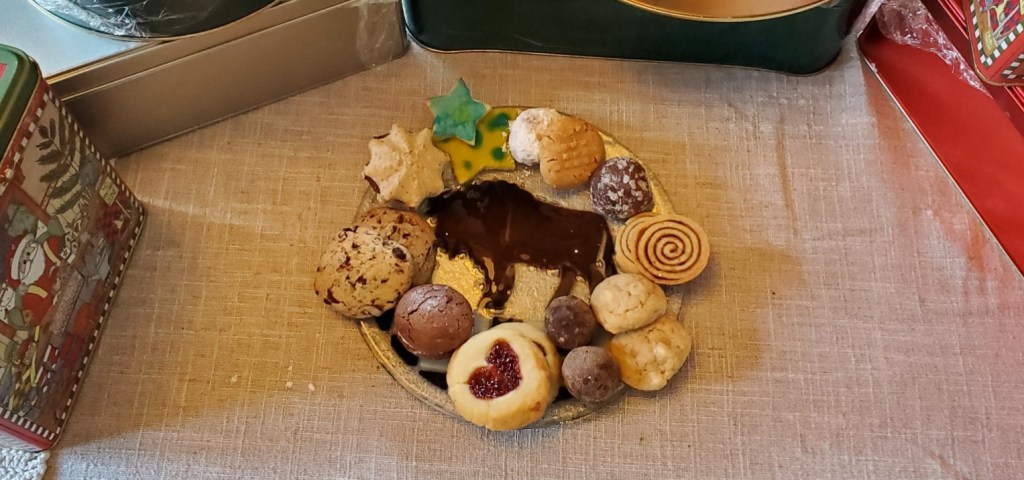 First because I know there are cookie fiends out there just waiting for this year’s round-up, I present Cookie Plate 2022, arranged on the fused glass bison presentation dish given to us by my sister and brother in law. I use it in tribute to the resilience of my Buffalo, NY family and friends, enduring their second (and twice as bitter) lash of winter weather since Thanksgiving. May the lights and heat stay on and may the driveway finally learn to shovel itself!