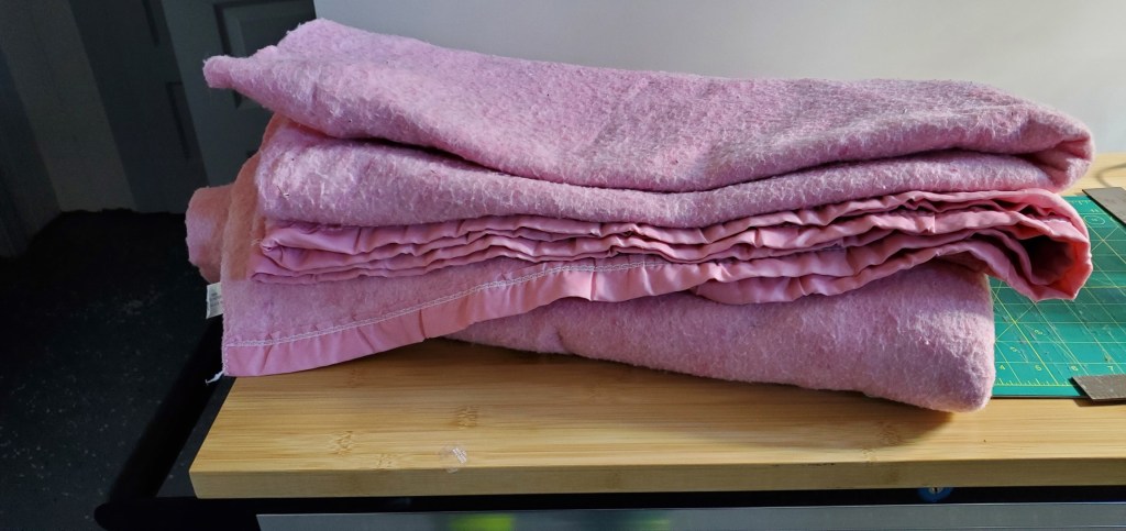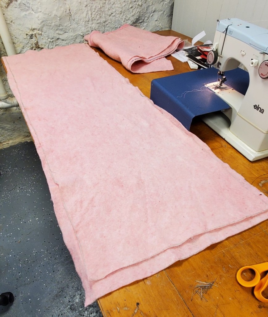 It’s acrylic and won’t fray, lofty, and detested both for its color, odd size, and affinity for scratchy bits of hay. It won’t be missed if it were to be cut up. So I carefully de-splintered it, washed it, and laid out the six pieces I would need (plus seam allowance). I had a lot left over, so I cut two additional panels for the front and the back, but slightly smaller. I zig-zagged them to the existing pieces, to sit inside the final assembly and provide extra cushiness.