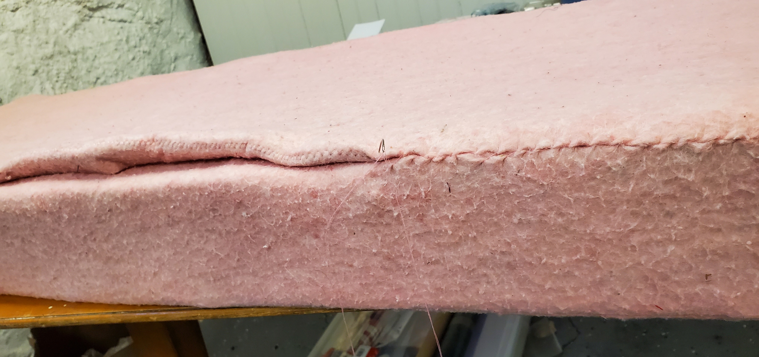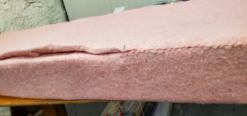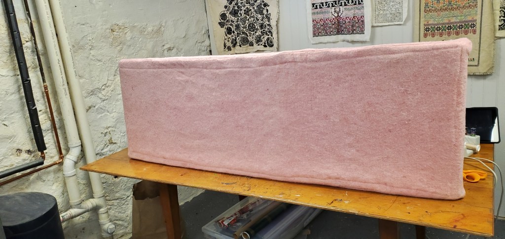 I began assembling the six sides to make my cushion cover, but discovered that my initial concept of making a big pillow slip and sliding the foam inside would not work. The grabby nature of both the foam and the pink fabric preclude that. Instead I assembled it “coffin style” – with the three edges of one of the long sides to be sewn by hand, instead of with the smaller end piece being stitched last. Here you see assembly and the final product. The pink stuff turned out to be very stretchy and unruly, and I ended up having to use more tension than I thought to get the cover fitted as closely as I could. The curved upholsterer’s needle helped a lot.