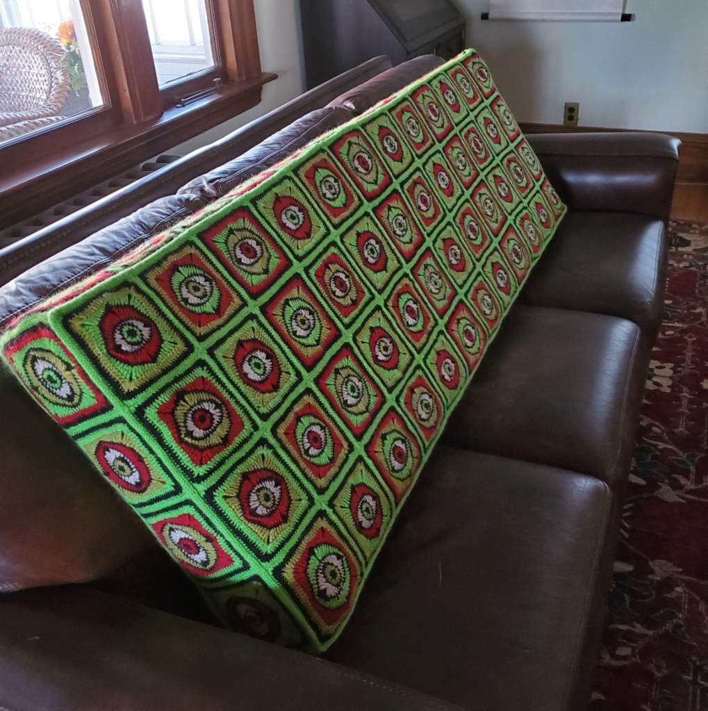After that is assembling those six crocheted sides into the final outer cover using knit-on I-Cord to simulate piping, inserting a zipper in one end of the thing so the cover can be taken off for laundering, and finally clothing my massive but naked cushion with its eyeball-festooned sweater. We’ve come a long way since Eyeball Day 1, back in early October.