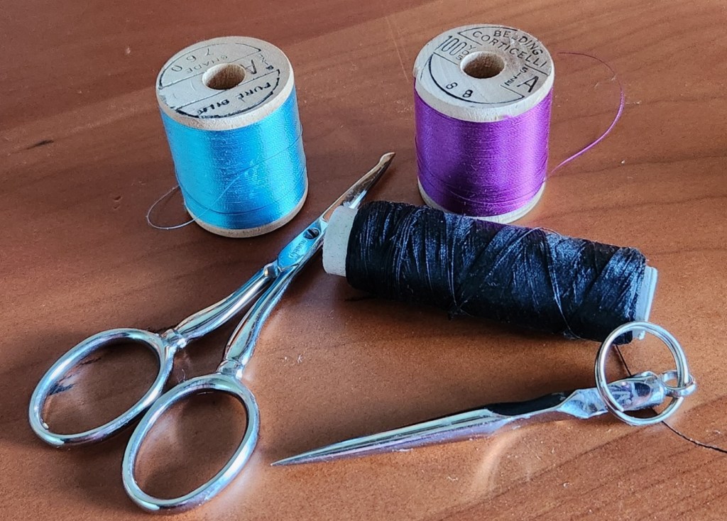 From top to bottom, RESIST was done in some vintage Belding Corticelli silk, size A. I have a bag of about 15 small wooden spools of the stuff in assorted strident colors. All are unstarted 100 yard spools, and most are singles. There are only a couple of colors for which I have two spools. Here are the two I stitched with on this project, along with the no-name black silk I’ve been using for (most of) the rest of this piece (small embroidery scissors and laying tool for scale).