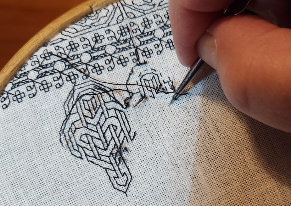 There are comparatively few descriptions of how to rip back safely, without danger to the ground or surrounding stitching. I’ll try to outline my method for doing so in double running. Cross stitch, back stitch and the like would follow most of the same process, with a little accommodation for stitch structure and working protocols.