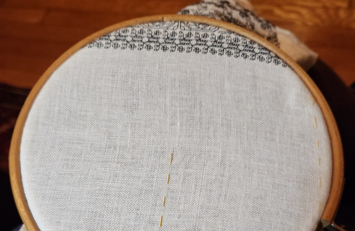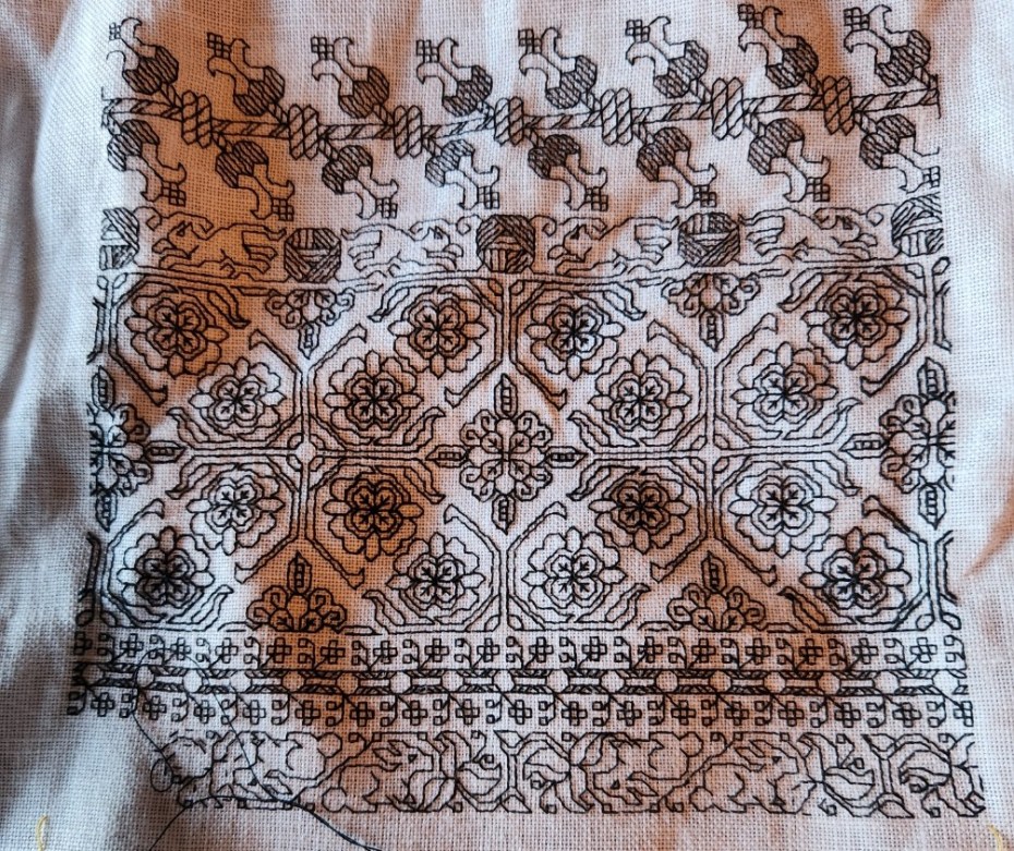 Moving down to the bottom, the very involved wide floral panel beneath the bunnies is also available free on this site. It’s the all-over I used for the discussion of how to redact a design. That discussion is here, complete with a link to the downloadable pattern. It can also be found on the Embroidery Patterns tab here on String. I enjoyed stitching this one. It went much faster than I expected because the design though involved covers a lot of territory but uses comparatively few stitches to do so.