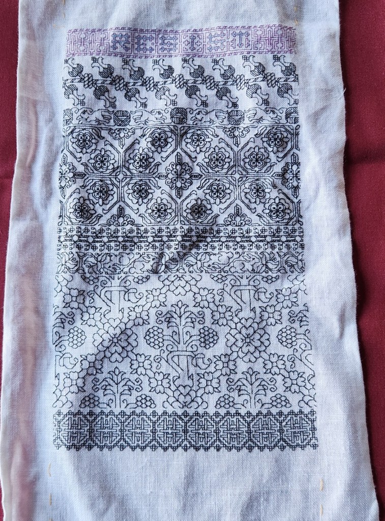 What’s next? Probably another in the PERSIST-RESIST grouping. ASSIST will be longer than RESIST. Also on a high count not-so-evenweave linen remnant. As you can see, the prep step of hemming has started.