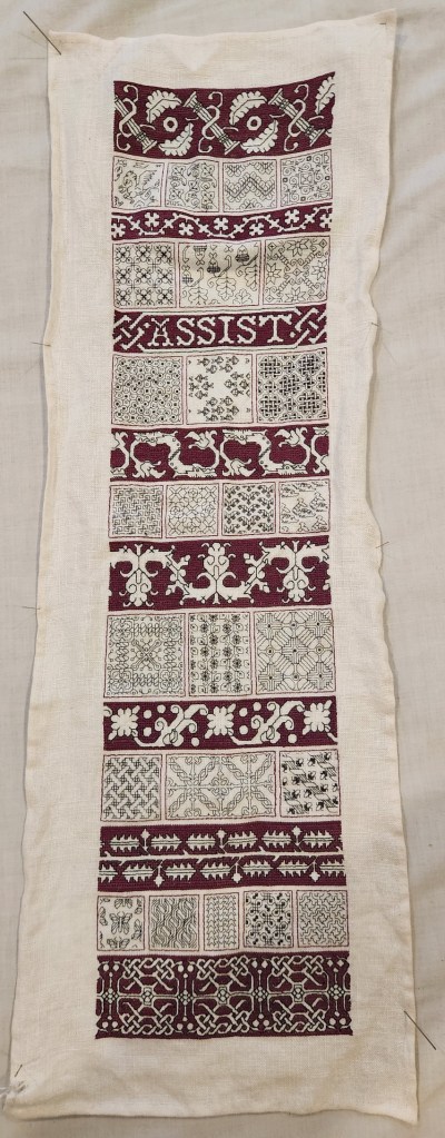 First, I’ve finished the wildly intricate interlace panel on my current sampler.