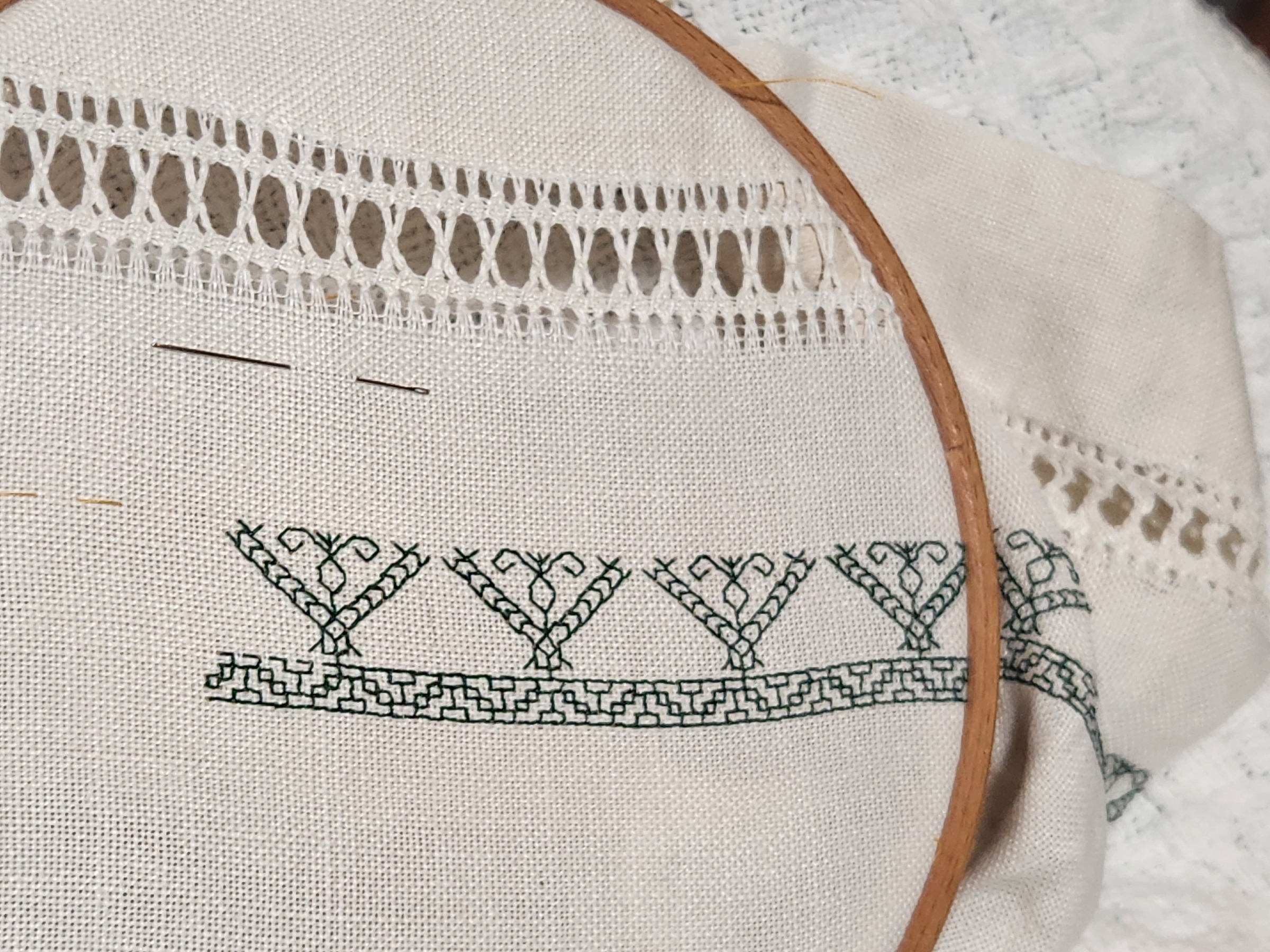In the mean time I am well into the first band (an edge accompaniment from T2CM Plate 25), although the final style for the Toys sampler has not yet been set. All I can say is that it will be worked in green DMC #890 cotton, and mostly in linear stitching. Nice view of the hem stitching here, too.