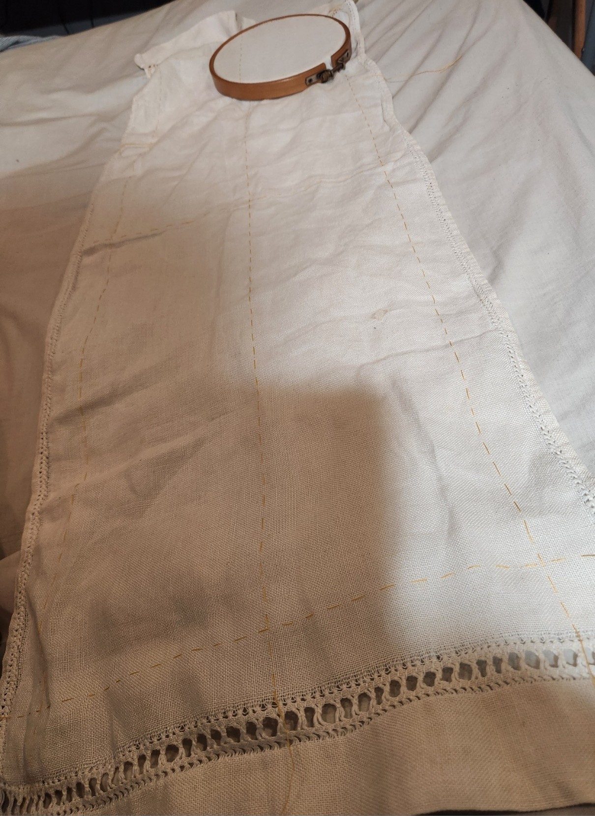 Again I pull out a battle-weary rescued bit of linen, yet another thrift store find. Yes, it has some flaws and stains. I don’t care (the title after all is Forlorn Toys). Most of that will be overstitched and very difficult to see. It happens that this piece is the longest yet, with the entire cloth (stitchable area plus margins) being 12 X 35 inches. And it sports nifty hand-done bits of Italian hemming done all the way around it. I’m leaving those intact. (Excuse the sickbed photo, I’m doing the best I can).