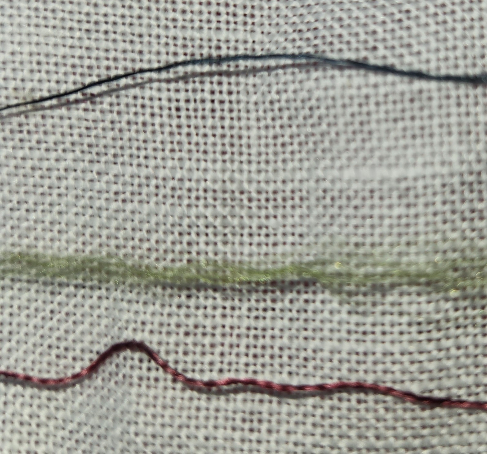 And then there’s selecting a size for the piece and preparing my ground. For that the first bit is to true the edges of the linen cut. To do that I find and pull the warp or weft thread at the narrowest point of the cut, withdrawing it entirely from narrow end across to the widest end. This gives me a clean line along which to cut, and ensures that my edges are parallel. On this piece of ground with one selvedge edge, you can see that the left and right sides perpendicular to the selvedge each are slightly skew, one by about an inch, and the other by about 3/4 of an inch.