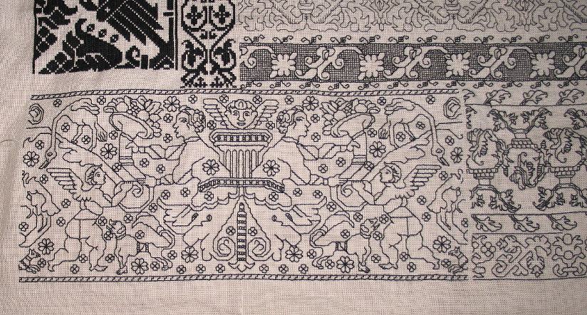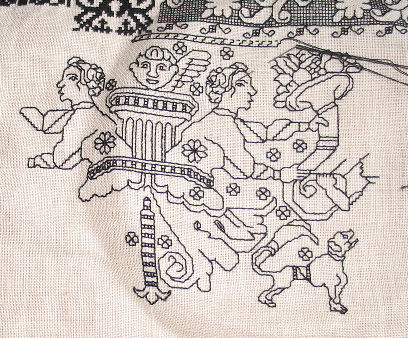 My variation differs in the way that the background’s handled. I won’t be working this one voided like the original. I also tinkered a bit with some of the interior elements, the banding for example right under the central cherub. In the original the darker little vertical elements are filled in with cross stitches. Mine uses plain ladder like elements, which I repeat elsewhere in the piece. Thanks, Kathryn! You remain my chief enabler, even after all these years. 🙂