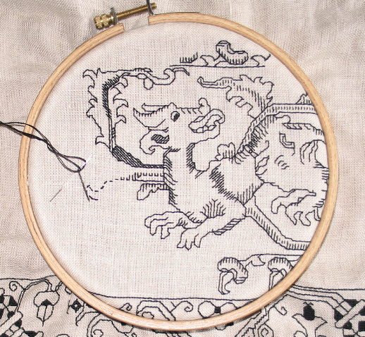 I’m not sure if this is a dragon, or a lion, or some other beastie, but whatever it is, I’ve made failed attempts to graph it from its original source. I’ve gotten close a couple of times, but never close enough to do the panel justice. I think I’ve hit it this time – fifth time’s the charm!