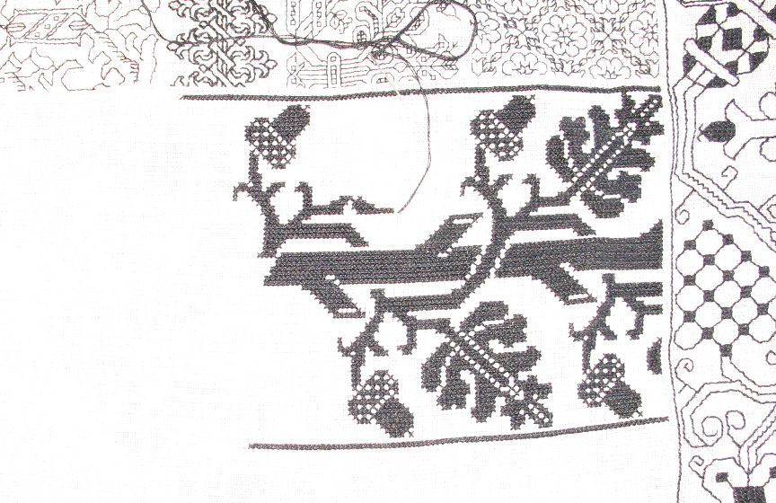 The plan is to make this strip the same length as the oak leaves. Eventually I’ll either find or noodle out an even denser band for the narrow area immediately to the right of the oak leaves, and a less dense but similarly black band to put between the current strip and the established horizontal bands. I might take a break from dense work for a while though, and opt to work something in double running elsewhere on the piece before attempting those two strips. There’s tons more room both north and south of these.