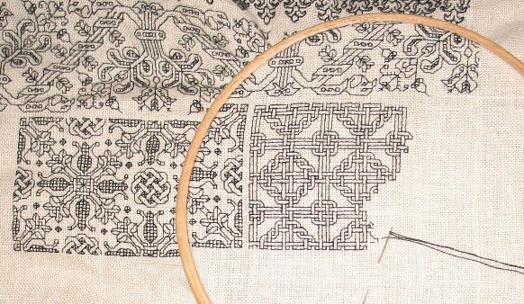 Next up is a new one though. It’s a double running stitch design graphed out from a photo of a period artifact (part of the upcoming book) but I haven’t tried it yet. The new panel will feature some small areas that are filled in. In the original they are stitched in the same stitch that is used to make a totally overstitched mesh like background on many other contemporary pieces. This style of stitching is most often seen worked in red, so densely stitched that in the mesh like areas no background linen is seen, and it’s most often used as the background on a voided style work, although there are examples of it being used as foreground, and (as in my upcoming trial – a spot accent).