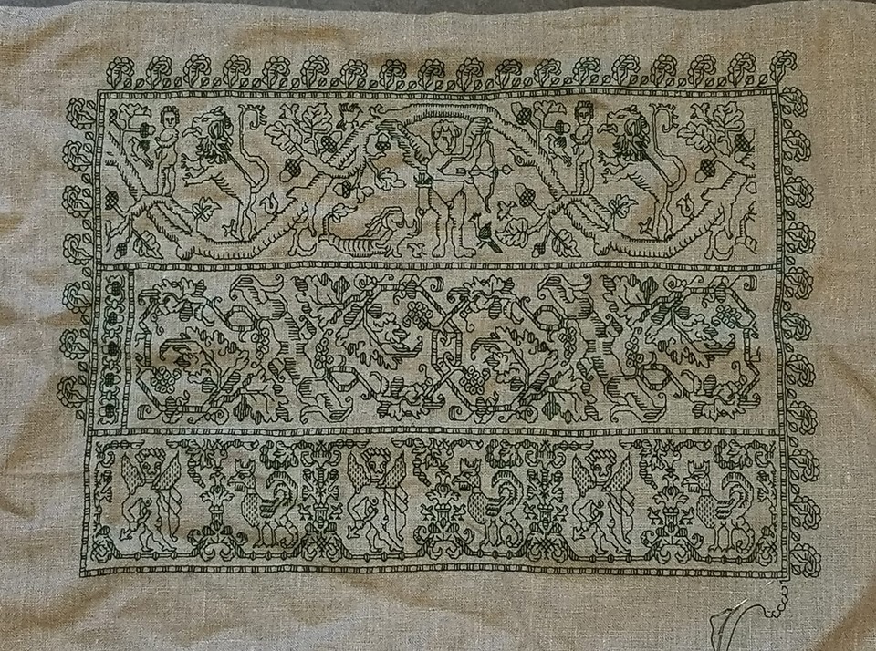 And here’s the same design, in the collection of the Cooper-Hewitt, Accession # 1971-50-96. This is the one I graphed up for eventual inclusion in the forthcoming Second Carolingian Modelbook, from which I stitched my rendition. Note that although the stitch counts in the bit below and my rendition are identical, my sample is distorted by the proportions of my ground cloth’s weave compared to the original, which is distorted a bit in the other direction.
