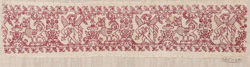 This example is in the Cooper-Hewitt Museum. Its citation is Band, 16th century; silk, metallic yarn on linen; H x W: 110 x 90 cm (43 5/16 x 35 7/16 in.); Gift of Richard C. Greenleaf; 1954-167-2
