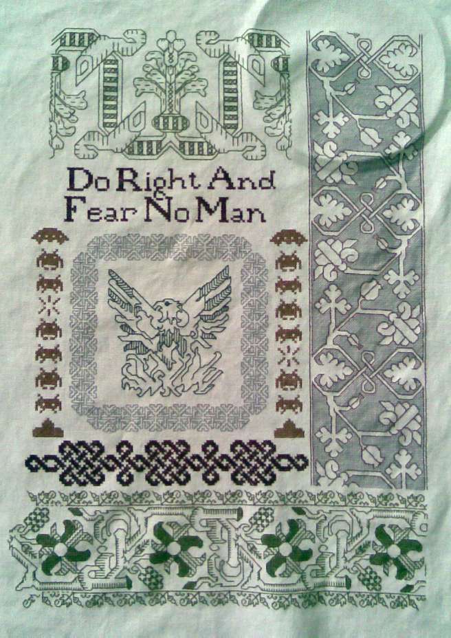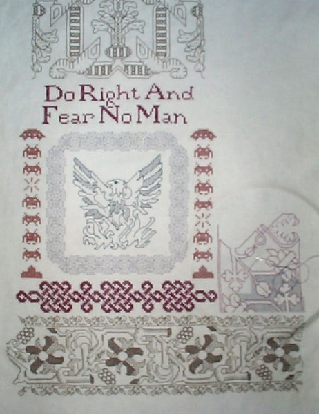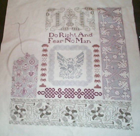 I’m not sure what to say on the new project yet, although I’m leaning heavily towards Clarke’s third law or Elbert (Roycroft) Hubbard’s “An idea that is not dangerous is unworthy to be called an idea at all,” but I will entertain suggestions of other similarly incongruous yet pithy non-sectarian sentiments. Feel free to post them as comments here. To head off one potential suggestion, I’ve already done one for The Resident Male that features “Do not meddle in the affairs of wizards, for they are subtle and quick to anger.” Eventually I’ll get around to sharing pix of that one here. It’s a long band sampler, done in deep red on cream linen. I doubt that 10% of the people visiting his office have read the saying.