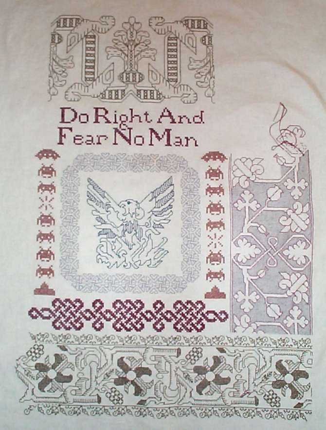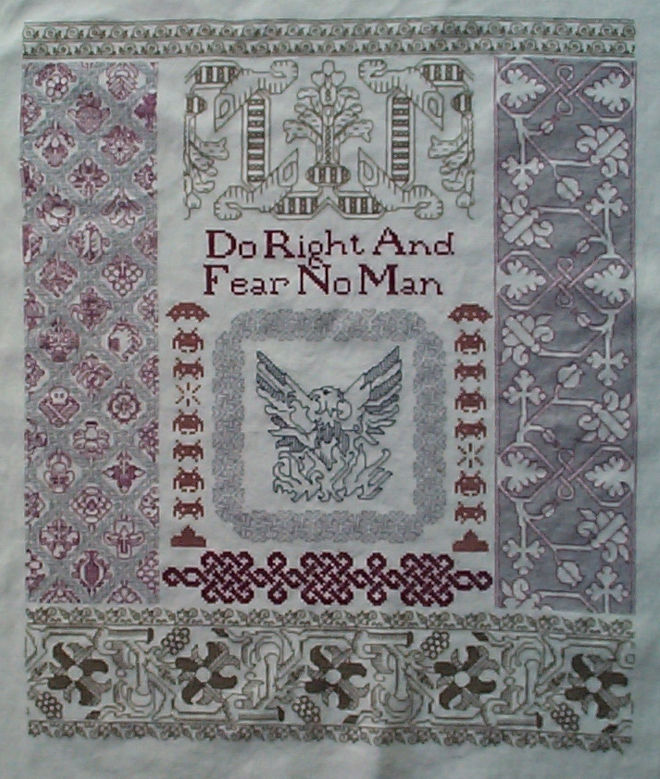 I’ve finished the right hand strip on my Do-Right sampler, plotted a strip of equivalent width on the right side, and settled on a pattern. I’m using another from TNCM – the Buttery pattern (Plate 59:1). This one is original, inspired in equal parts by historical motifs, a happy communal house where many friends have lived over the years, and boredom.