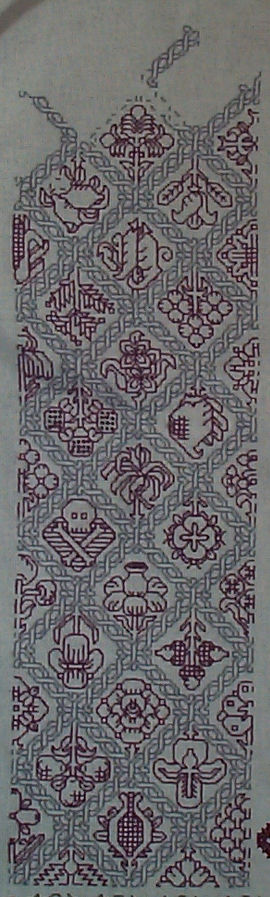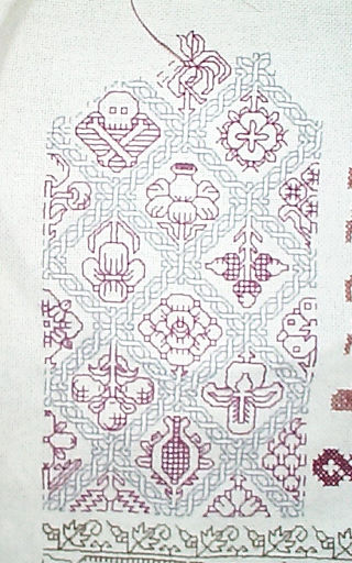 This new pattern, like the majority of the others is pictured in The New Carolingian Modelbook. This one is the other pattern on Plate 63 (63:1). The ribbon bit at the center top is on that same page. This one I graphed up from a photo of an artifact appearing in Lanto Synge’s Royal School of Needlework Book of Needlework and Embroidery. It’s a curious piece, stitched without background in blue silk. The curious part is the reverse gives clues that it might have been done in something like reverse chain stitch, with the chains on the back, showing a top appearance similar to double running. I’m working it in plain old double running, and have chosen to accent the pattern with a background of half-cross stitch. I’m working the background with verticals and horizontals on the reverse rather than reversibly as true double running because I’m short on the gray thread, and want to economize as much as possible. Better pix on this panel soon, I promise.