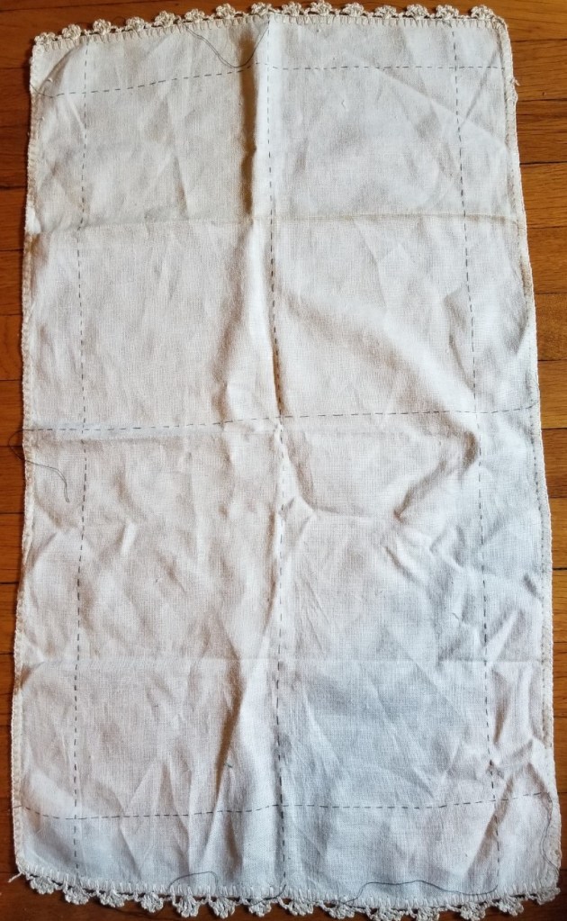 For the next project I’ve decided to use a well washed linen piece I picked up at a yard sale in Silver Spring, Maryland easily 42 years ago. It’s a dresser scarf, trimmed with a hand-turned hem secured by a simple crochet, with a crochet picot edge on the short sides. Based on the materials and back story I suspect it was cut down from a larger cloth and trimmed out sometime in the late 1930s or 1940s. I got it the same time as I got the larger finished linen piece that became my Everything is Worth Doing Well sampler, although they were not cut from the same source. Yes, it’s worn and a bit discolored from storage even before I got it, but it’s sound.