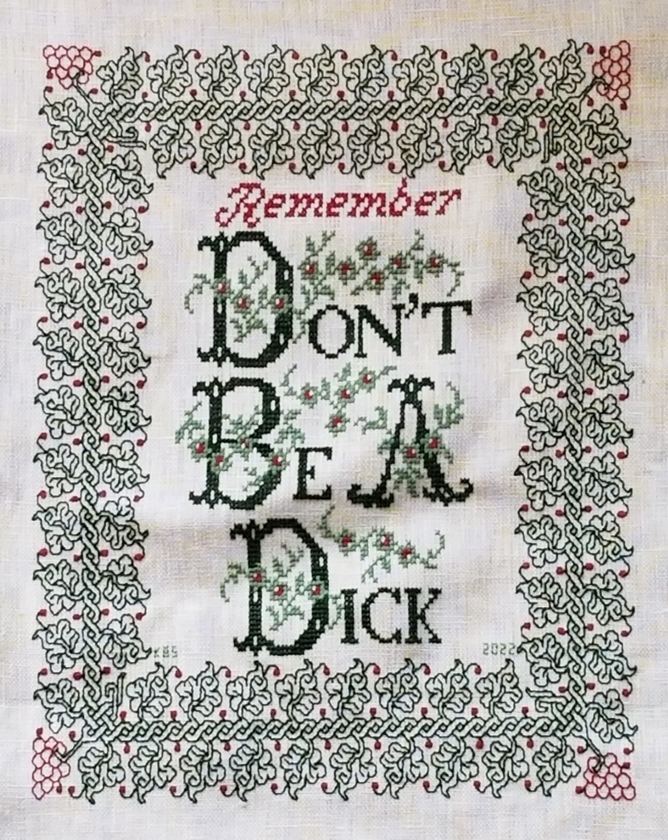 Because when I started stitching the border at the left center line, instead of starting it at the center of one of the sprigged spirals, I started with one of the spirals that grows a leaf. That de-centered the inscription north/south. I walked happily down the left edge, across the bottom, and up the right side. When I got to the top I noticed that (horrors!) to make my corner fit there would be larger space between it and the words than there is at the bottom. Nine units more, to be exact. So I thought about what I could put there. More flowers? Possibly. Another ornament? Again possible. But the more I thought about it, the more I wanted to NOT add mass on top which would draw attention to the lack of space at the bottom. So a word was the way to go.