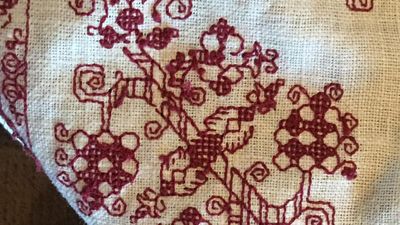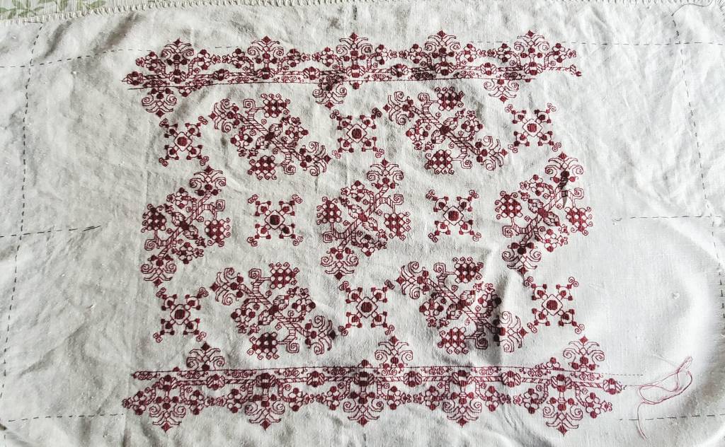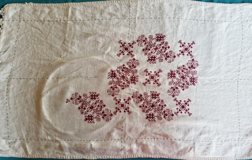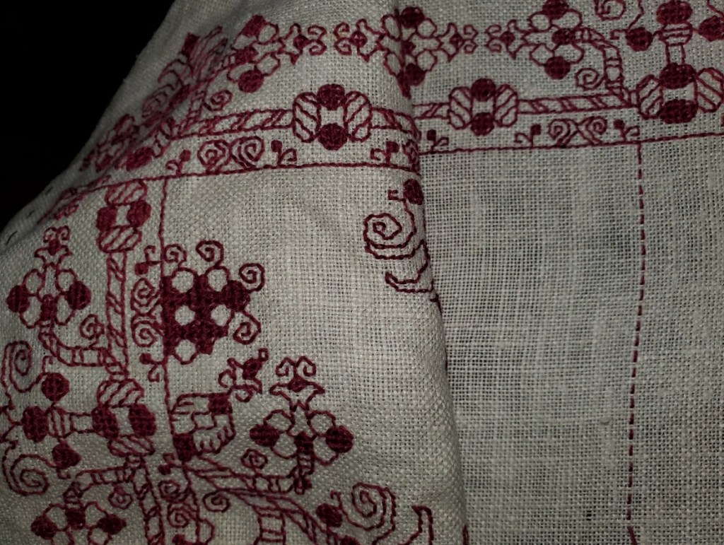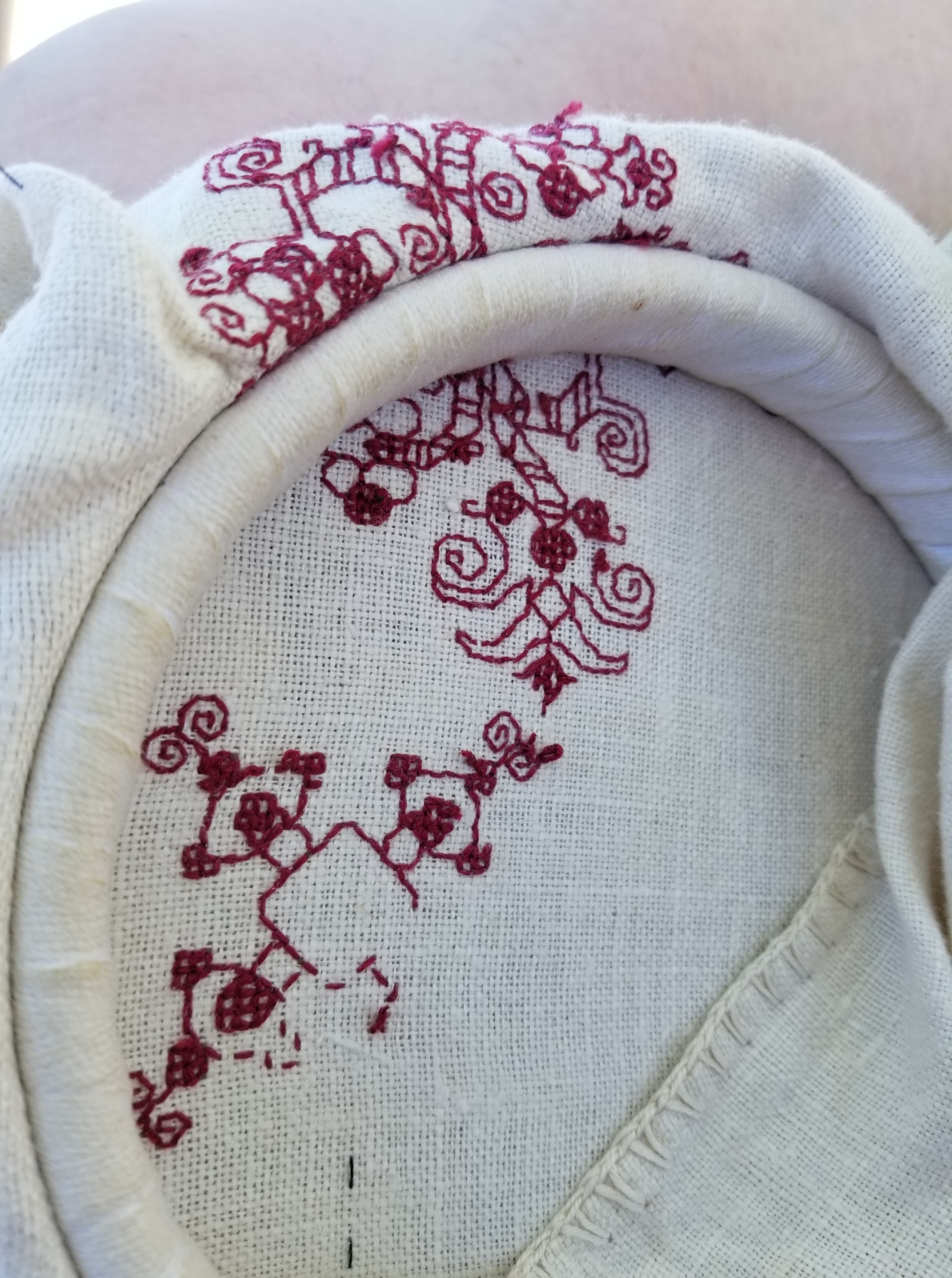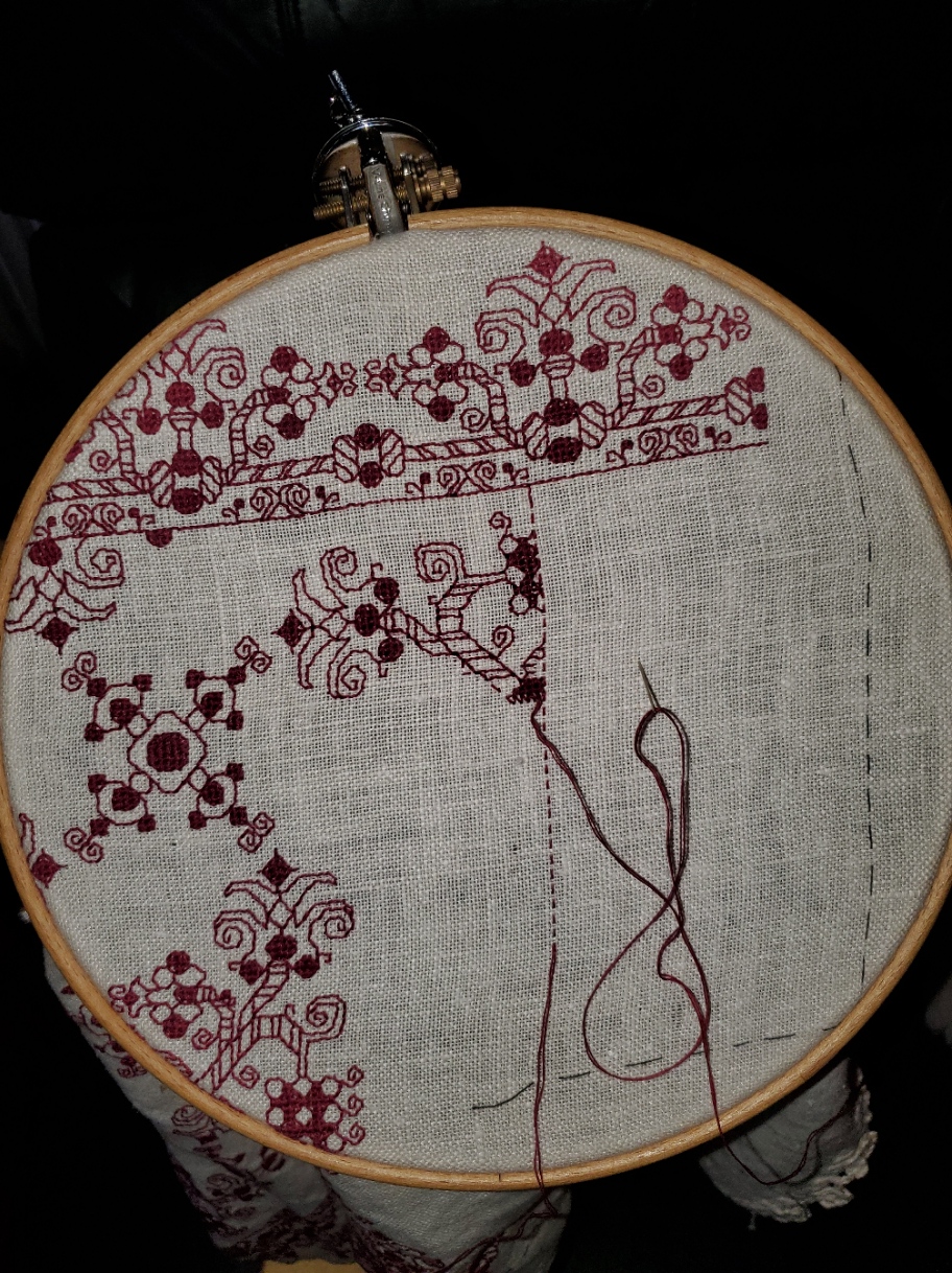 I stitched the design in garnet cotton (DMC #815). It took almost all of seven skeins. I worked the linear bits in double running, and the solid bits in a variant of Italian four sided cross stitch (basically cross stitch, but in a box). The version I chose is NOT double sided, instead it produces a grid on the reverse. The only reason why I chose that version is that I hadn’t attempted it before. I have no historical reason to pick it over the more usually done fully two-sided version. The full double sided version is more or less the same stitch that forms meshy totally overstitched grounds, but done “gently” as surface stitching, and not pulled to the max to both totally encase the ground threads and produce the characteristic mesh ground found in so many museum artifacts. Here’s my back showing the grid structure of my single-sided interpretation.