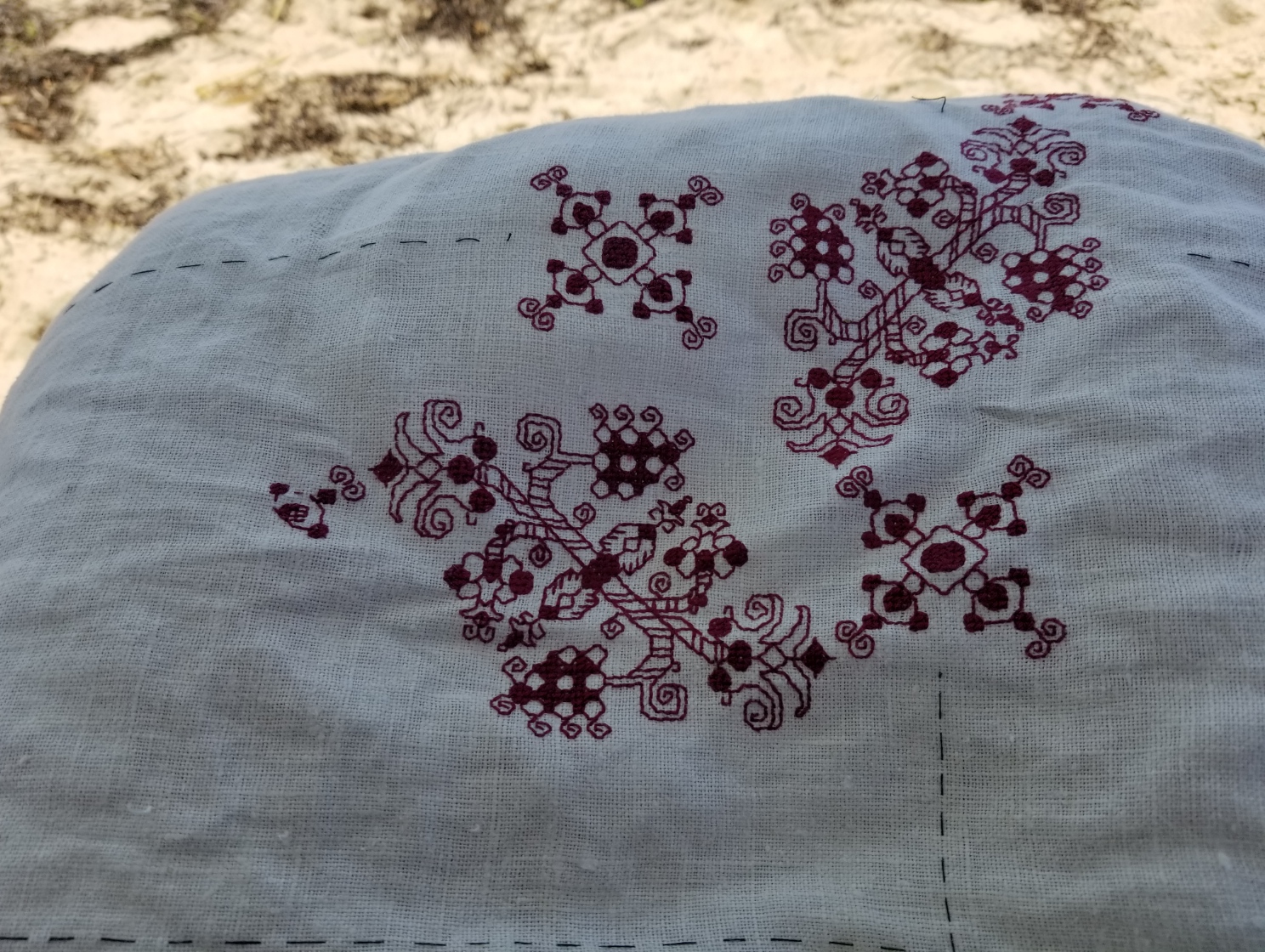 I also determined the thread count of this well washed, buttery soft vintage linen. It averages about 32 threads per inch, but is quite uneven, ranging from 28 to 34 in places, but didn’t dwell on that beyond satisfying myself that there was enough “real estate” inside my designated area to accommodate at least two full repeats of my chosen design across the narrow dimension.