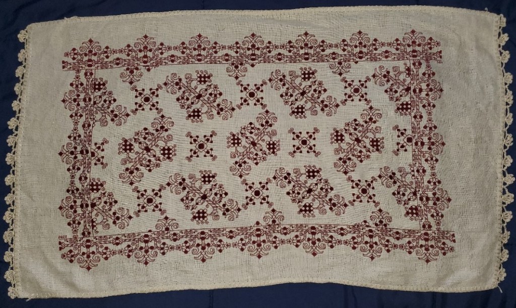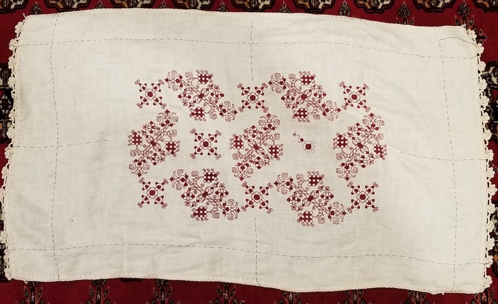 It’s true I didn’t know how I was going to proceed when I began this project. I had a graph for the main field repeat, but only one iteration of the design, but not a chart for the entire area that design would inhabit. I didn’t have a border (yet). I had a piece of cloth of dubious cut and unknown count, and I had picked a thread well represented in my stash, with known easy-care laundry properties. I knew I wanted to make a large placemat type sideboard scarf, as big as attainable given the materials on hand.