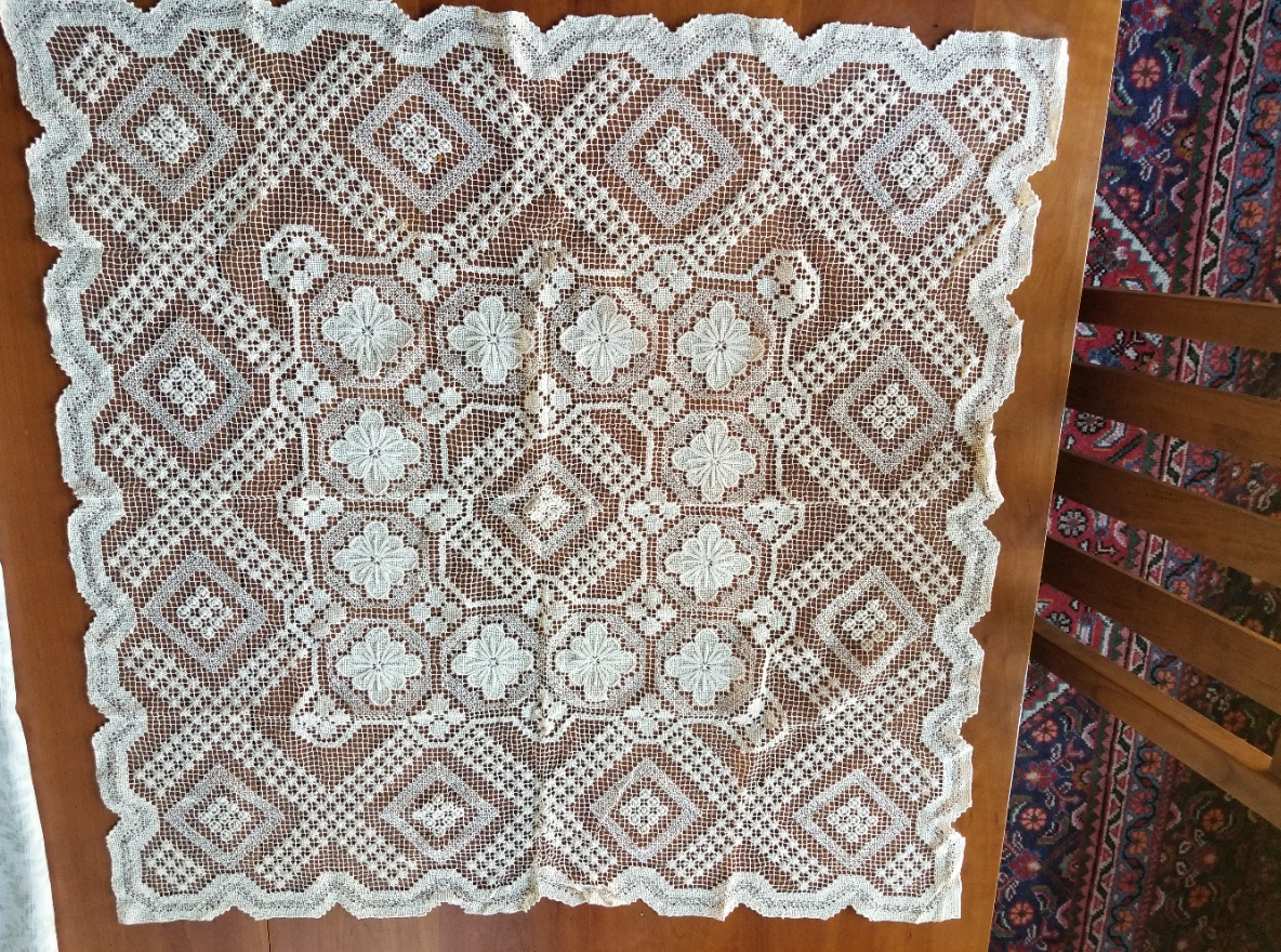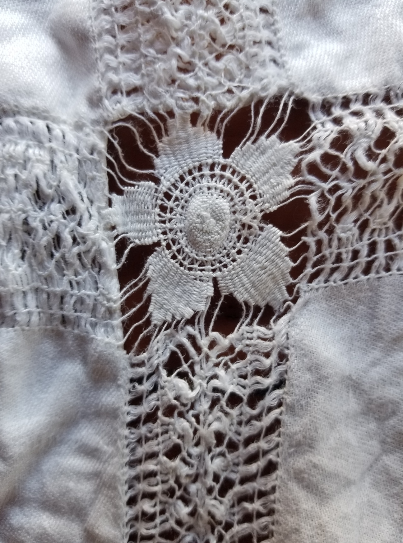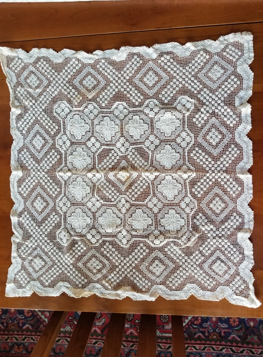 Among my discoveries were two darned net bridge cloths (small square table spreads). The substrate is hand knotted, in cotton, as is the darning and embroidered embellishments on top. I’m not good at dating/sourcing these pieces, but I suspect these are Sicilian Modano work, not earlier than 1920. Both are in very good condition with a couple of tiny brown “age spots” – probably the legacy of old spills. I don’t know enough to differentiate the earlier pieces of Modano from those of its 1980s revival. In the detail shot you can see the two weights of threads used for the darned fills, plus the long attached woven bullion style “picots” – not exactly sure what that stitch is called, plus a bit of straight stitch outlining.